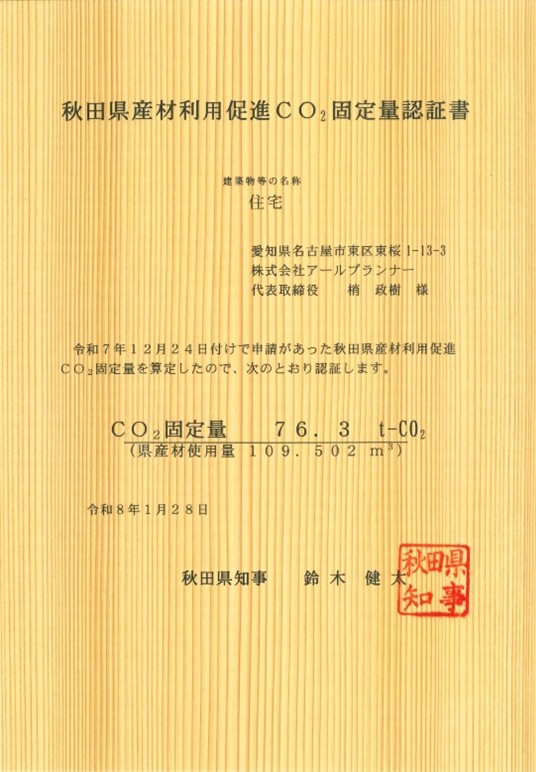 環境に配慮した家づくりを推進「秋田県産材利用促進CO2固定量認証書」を受領