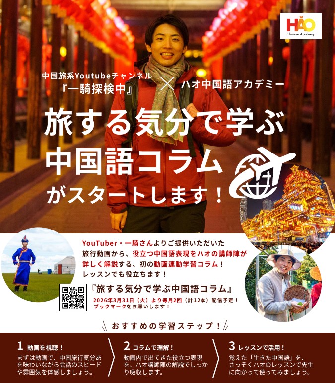 株式会社イーオン、ハオ中国語アカデミーにて、YouTubeチャンネル「一騎探検中」×ハオ中国語アカデミーのコラボ企画「旅する気分で学ぶ中国語コラム」がスタート!