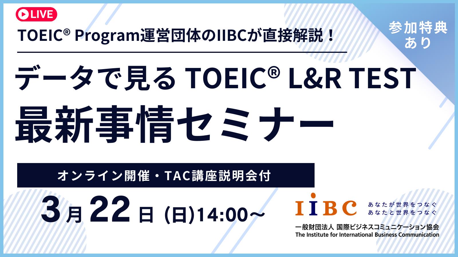 IIBC×TAC株式会社共催、3/22(日)オンラインセミナー開催!TOEIC(R) L&R TESTの最新情報や活用事例、スコアアップ戦略を解説!