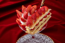 スイーツパラダイスのいちごパフェは、ビッグな苺ミルフィーユが乗ったぜいたくスイーツ♪