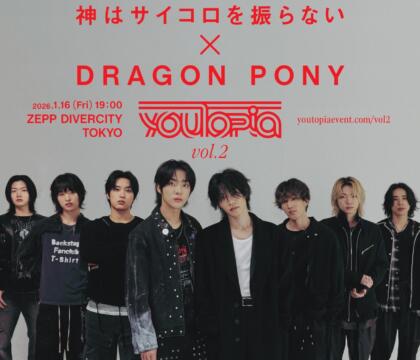 2026年1月16日に行う対バンライブ『youTopia vol.2』。ここで夢の共演を果たす“神はサイコロを振らない”とDragon Ponyは、国境を越えて尊敬できる先輩・後輩としてはやくも仲良しに。3回…