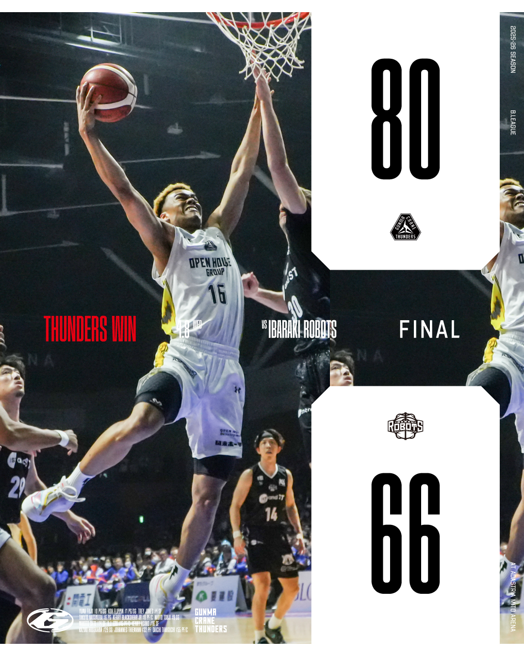 【群馬クレインサンダーズ:試合結果】4/8(水) vs 茨城ロボッツ りそなグループ B.LEAGUE 2025-26シーズン -
