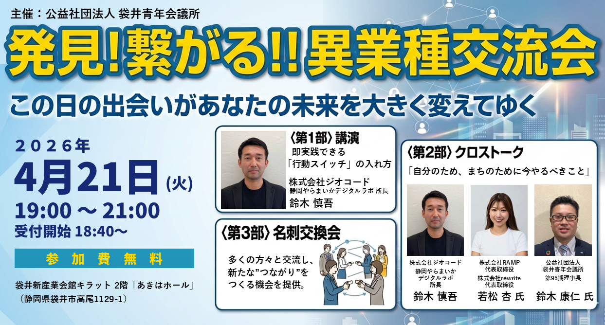 袋井青年会議所主催「発見!繋がる!!異業種交流」の講演・クロストークにジオコードの静岡やらまいかデジタルラボ所長・鈴木慎吾が登壇 -