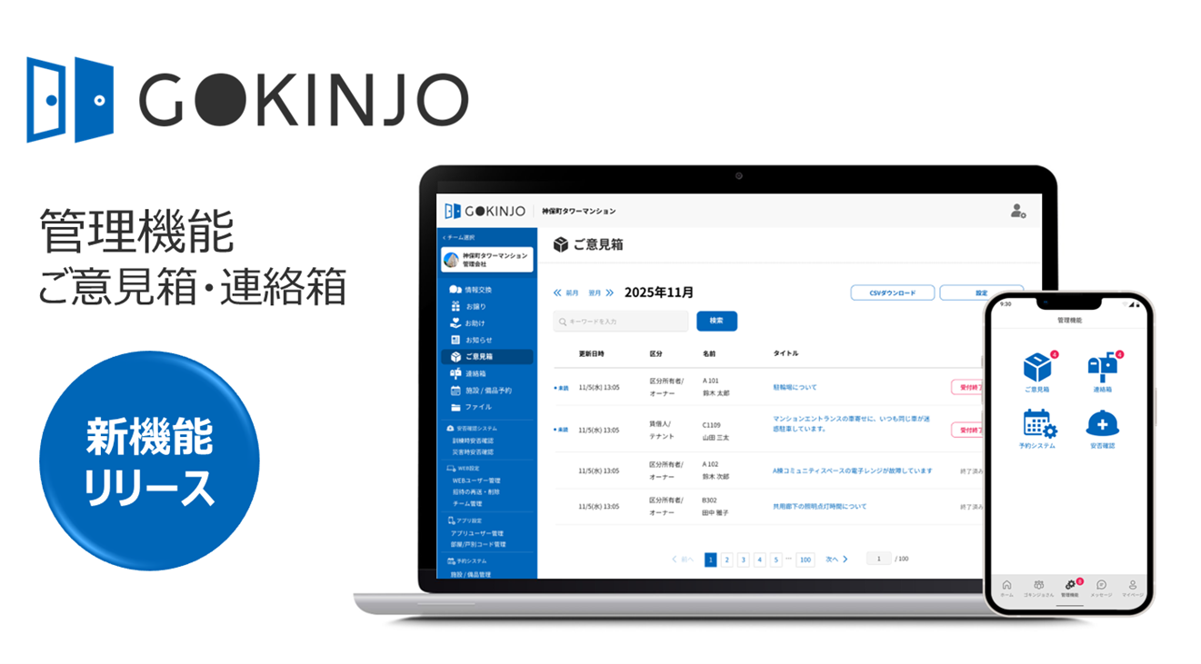 マンション・街の住人向けコミュニティ醸成サービス「GOKINJO」新機能「管理機能(ご意見箱・連絡箱)」提供開始