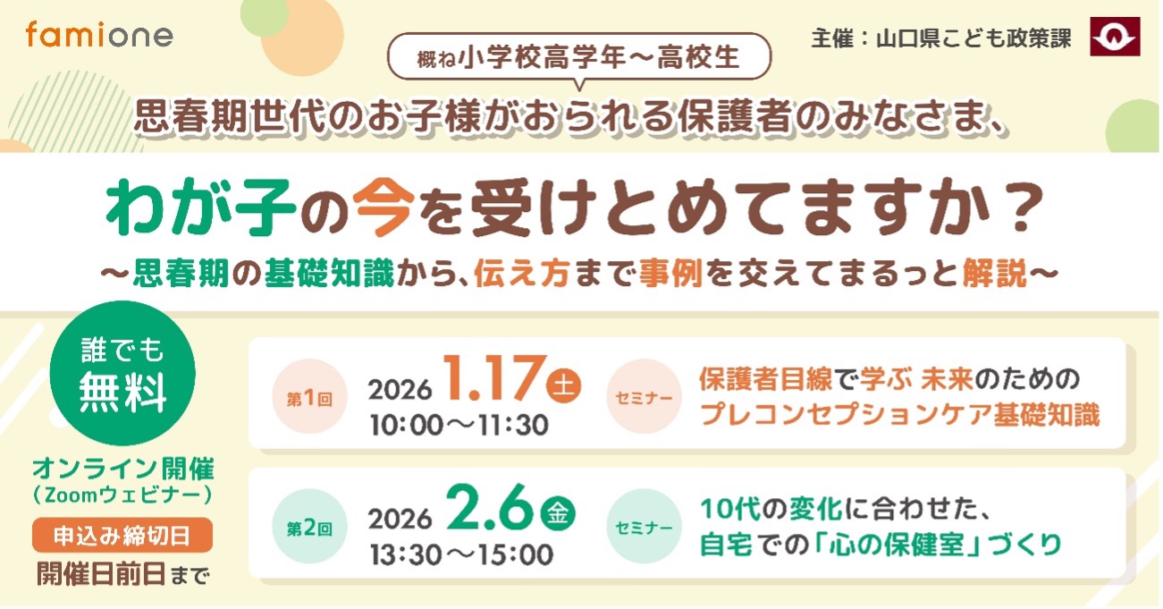 山口県にて、思春期のお子さんをもつ保護者の方へ向けた県主催の無料オンラインセミナーを1/17(土)・2/6(金)に開催します -