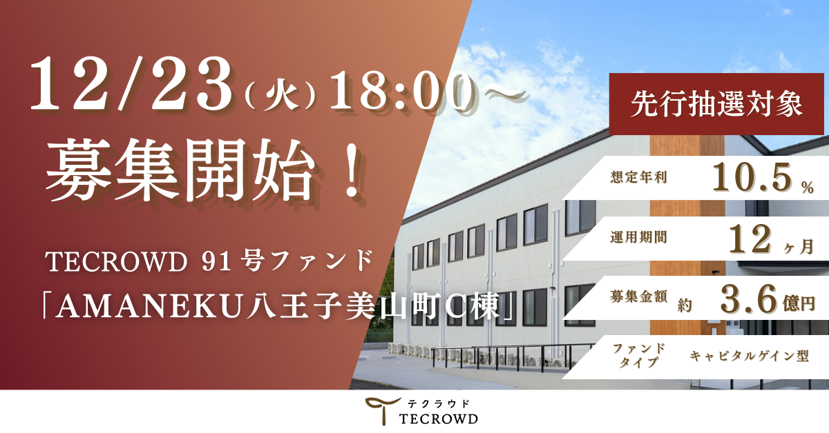 【想定年利10.5%】国内キャピタルゲイン型ファンド「AMANEKU八王子美山町C棟」に投資するTECROWD91号ファンドの募集開始 -