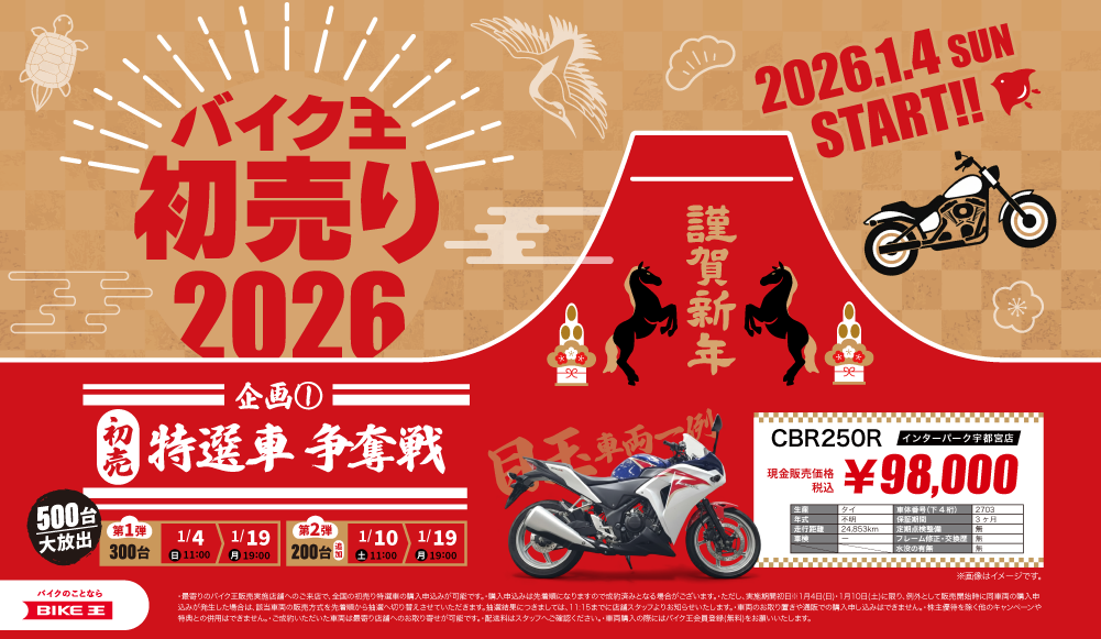 「バイク王の初売り2026」初売り特選車争奪戦は合計500台大放出!98,000円~ -