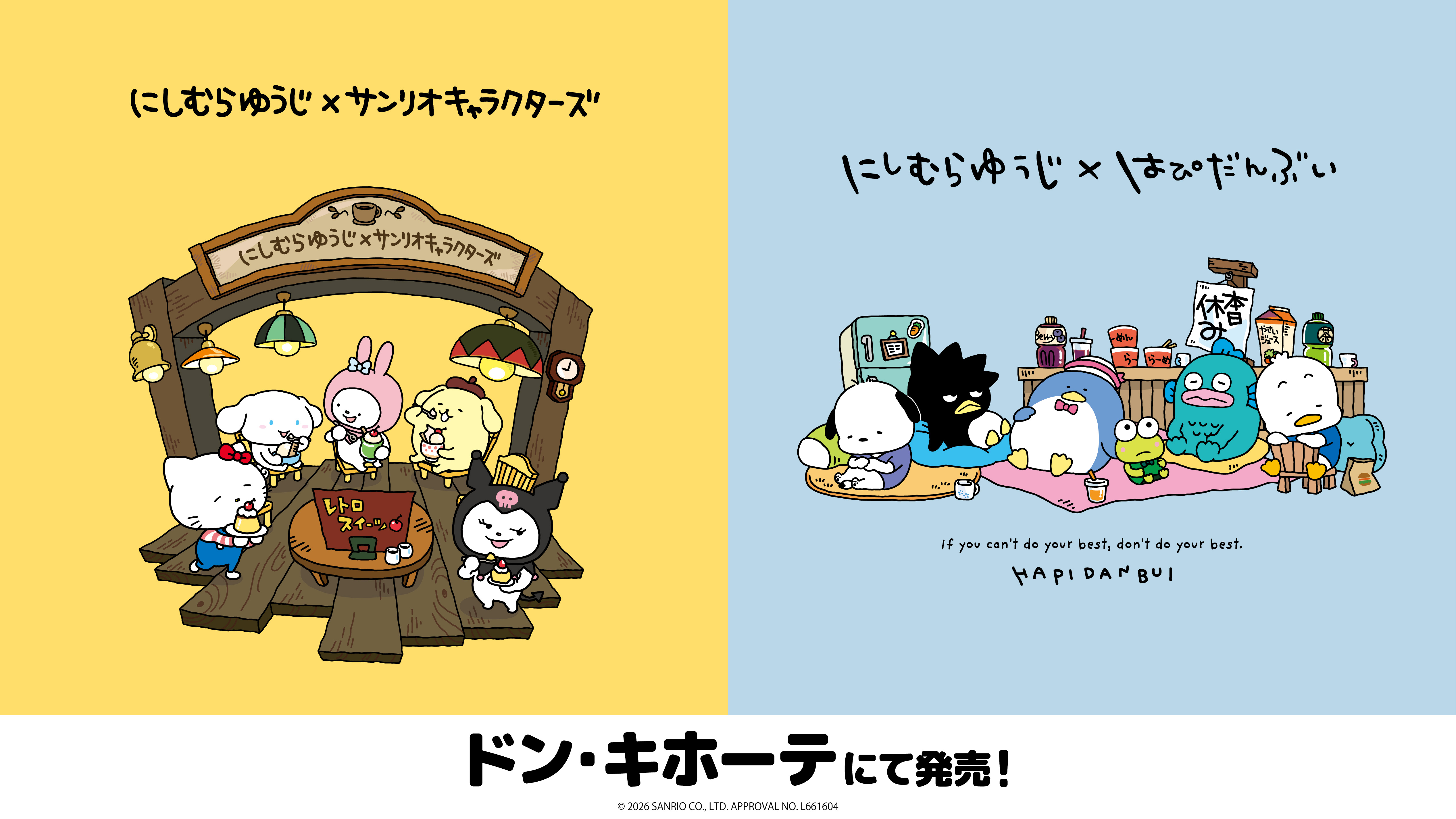 「にしむらゆうじ×サンリオキャラクターズ」の新作ウェアの発売と前弾で好評だったウェア・グッズの再販が決定!3/20(金)より、全国の「ドン・キホーテ」にて発売開始!