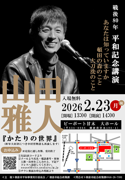 【福岡県朝倉市】戦後80年の節目に「平和記念講演」開催 山田雅人『かたりの世界』~あなたは知っていますか 頓田の森のこと 大刀洗のこと~
