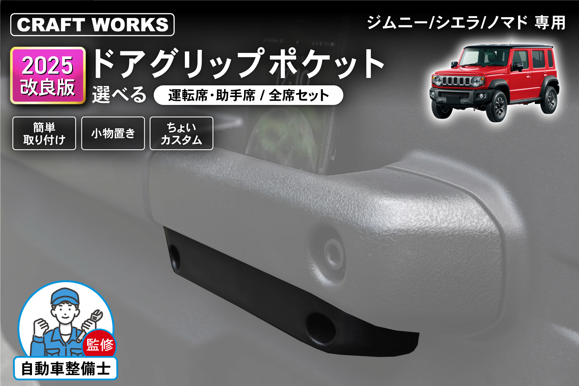 【2025年改良版】ジムニーシエラ/ノマド専用「ドアグリップポケット」販売開始。 ドアグリップはそのまま、便利な収納をプラス。純正ネジでしっかり締まり、簡単に取り付け可能。カスタム初心者にもオススメ!