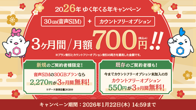 MVNOサービス「LinksMate(リンクスメイト)」で音声通話+SMS+データ通信+30GB+カウントフリーオプション加入で3ヶ月間税込み700円になる「2026年ゆく年くる年キャンペーン」を開催