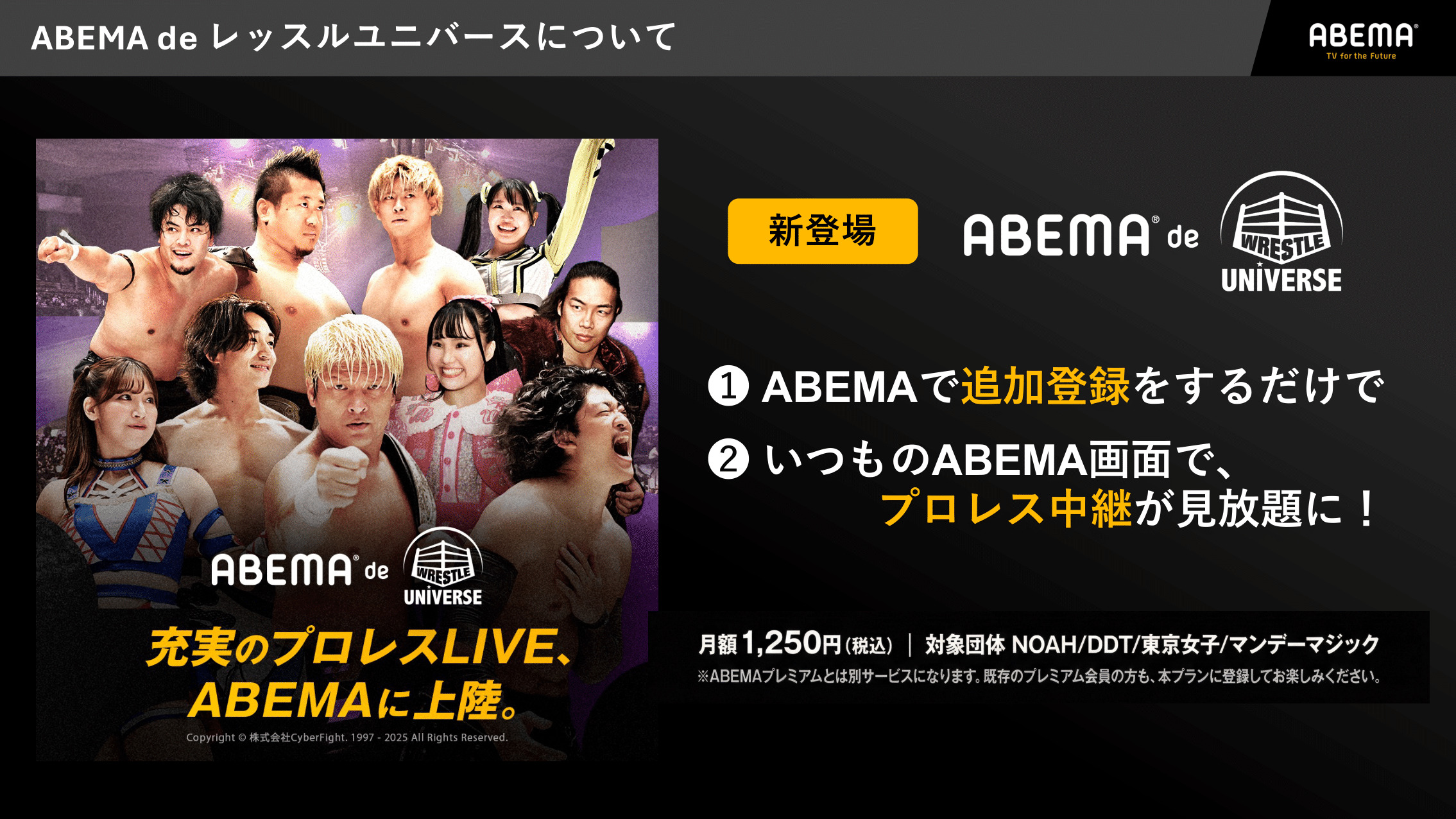 「ABEMA de レッスルユニバース」を2025年12月22日(月)より提供開始、DDTプロレスリング、プロレスリング・ノア、東京女子が生中継する全興行が視聴可能に