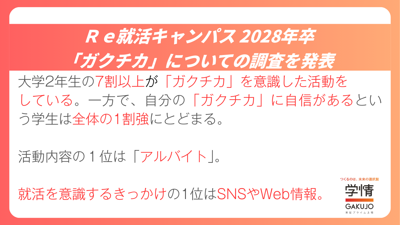 【28卒学生調査】大学2年生7割以上が「ガクチカ」を意識した活動。一方、「ガクチカ」に自信を持てる学生は全体の1割強。活動内容1位は「アルバイト」。就活を意識するきっかけ1位はSNSやWeb情報。
