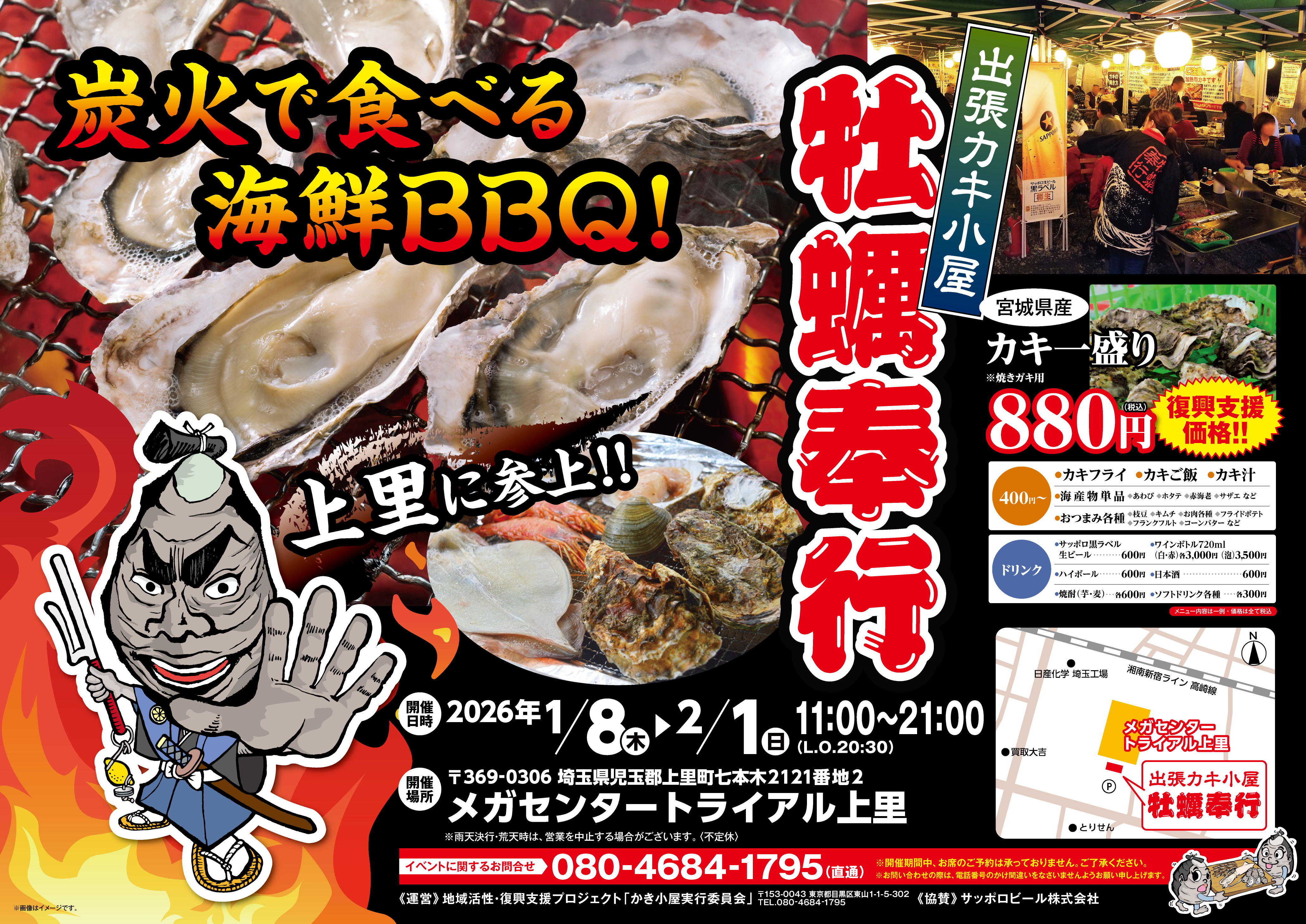 埼玉県メガセンタートライアル上里に「出張カキ小屋」参上! 1月8日~期間限定開催!《 宮城県産殻付き牡蠣が一盛り880円!! 》 -