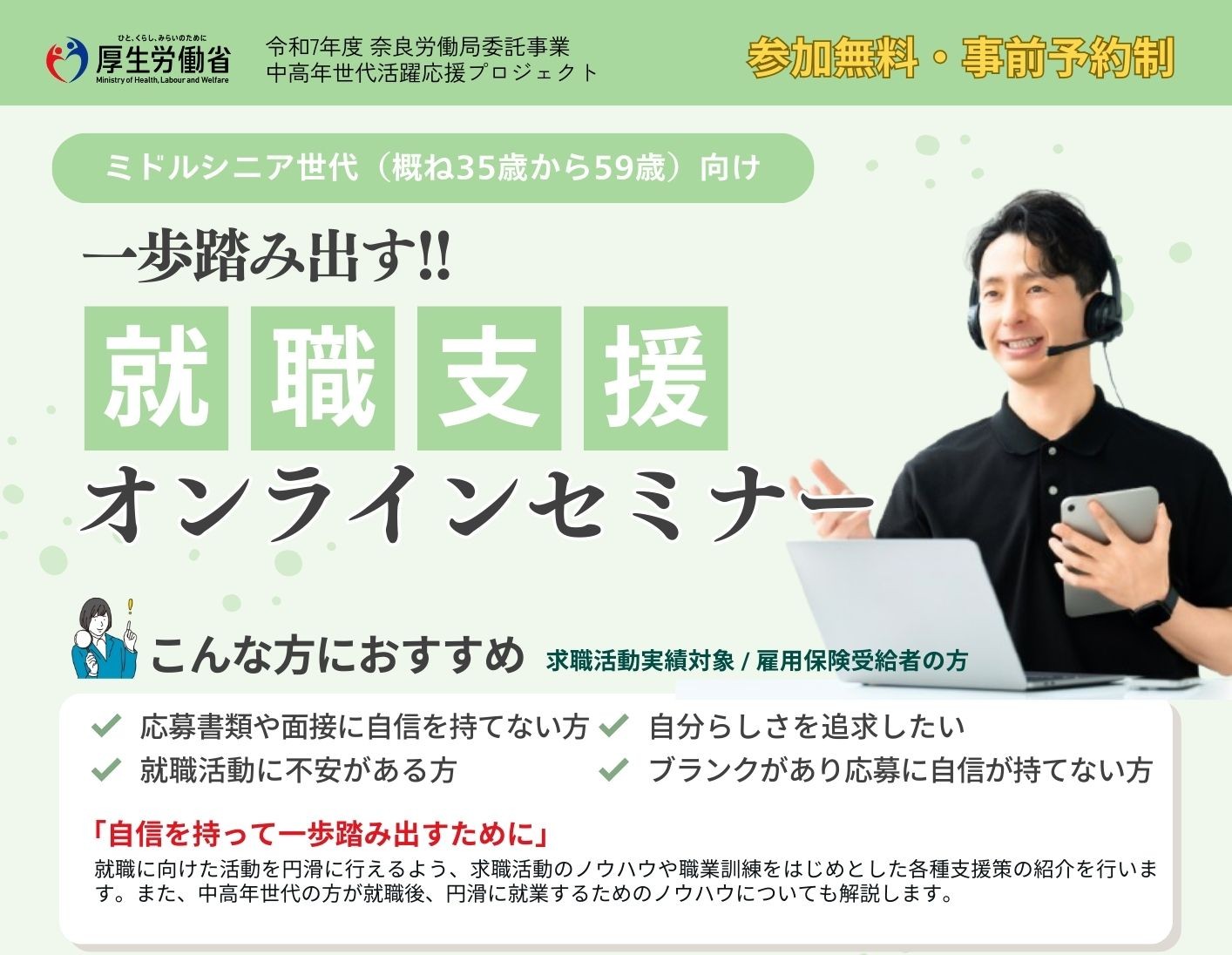 【オンラインセミナー】ミドルシニア世代(概ね35歳~59歳)向け 就職支援オンラインセミナー(奈良労働局委託事業 令和7年度中高年世代活躍応援プロジェクト) -