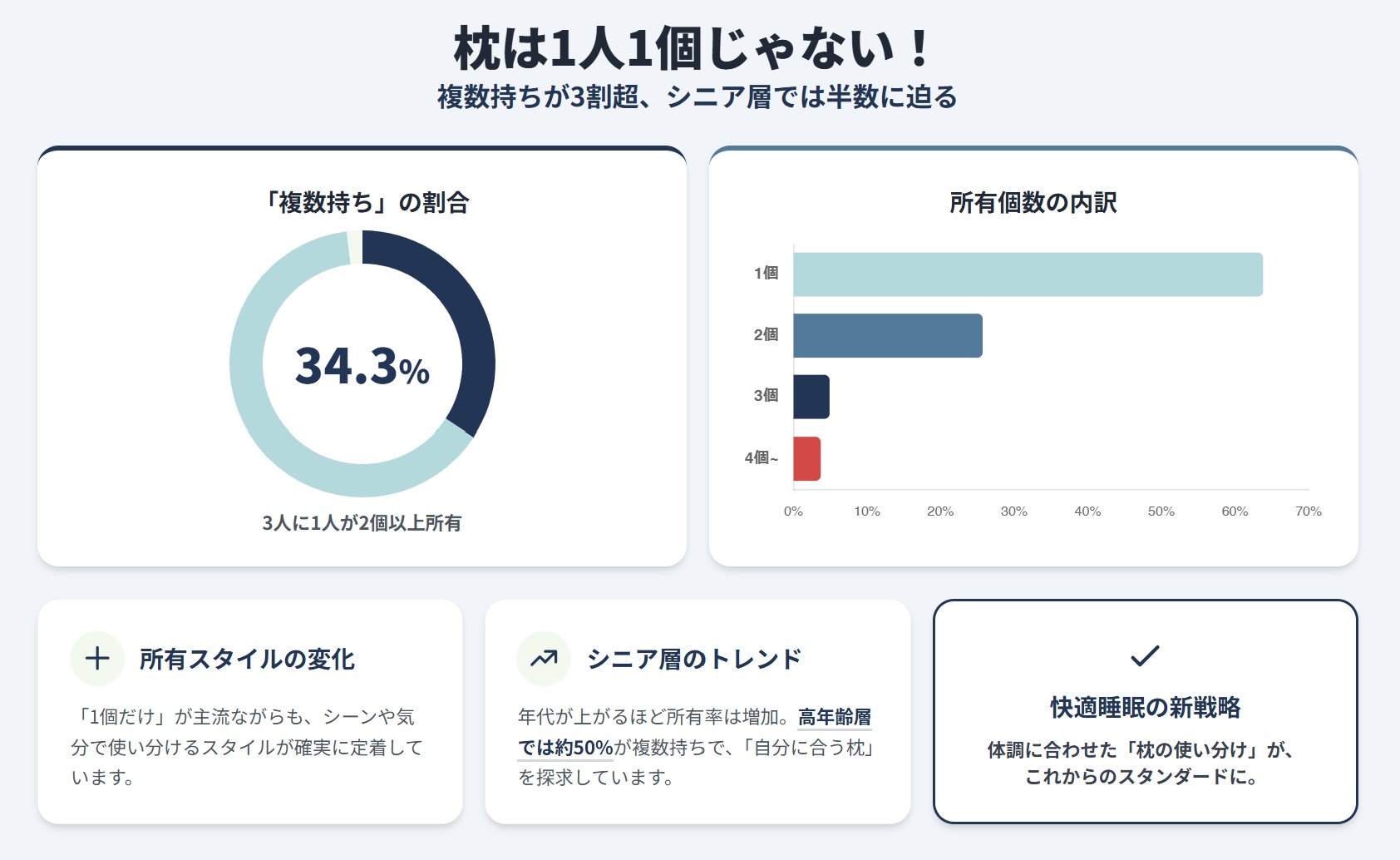 枕は「1人1個」から「1人2個」の時代へ!枕の保有個数に関する調査を実施。枕の複数持ちが3割以上との結果に。枕難民の増加や、体調・気分で使い分け、ライフスタイルに合わせた「枕の多様化」が影響か? -