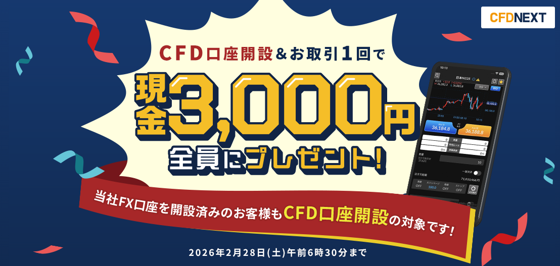 「CFD口座開設&お取引1回でもれなく3,000円プレゼント!キャンペーン」実施! -