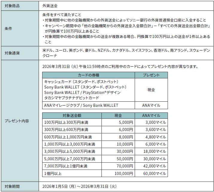 ソニー銀行への外貨送金で現金またはANAマイルプレゼントキャンペーン実施のお知らせ -