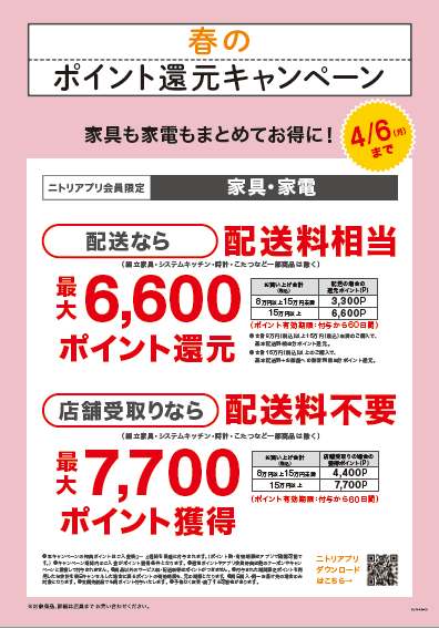 【ニトリ】春の生活を応援!家具・家電の購入で最大7,700ポイント獲得「春のポイント還元キャンペーン」1月30 日(金)からスタート -