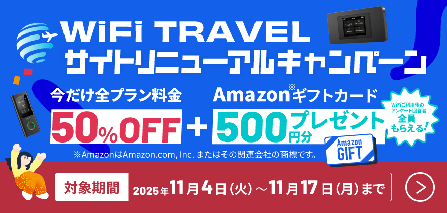 海外WiFiレンタル『WiFiトラベル』リニューアル記念!全プラン50%OFF+Amazonギフトカード500円分プレゼントキャンペーン実施中 -