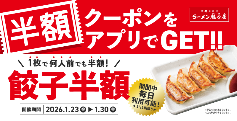 【餃子半額ウィーク!】アプリ会員限定で「餃子半額クーポン」を配布!2026年1月23日(金)~2026年1月30日(金)の8日間実施 -