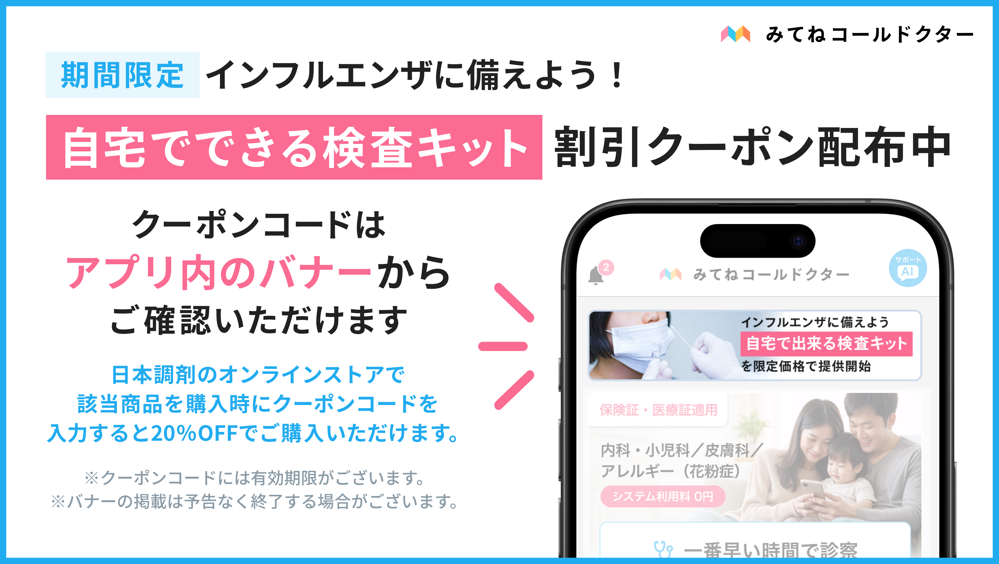 医師監修オンライン診療アプリ「みてねコールドクター」が日本調剤と連携し、インフルエンザ・コロナ同時検査キットを限定価格で提供開始。今年の冬は、自己検査キットとオンライン診療の活用を -