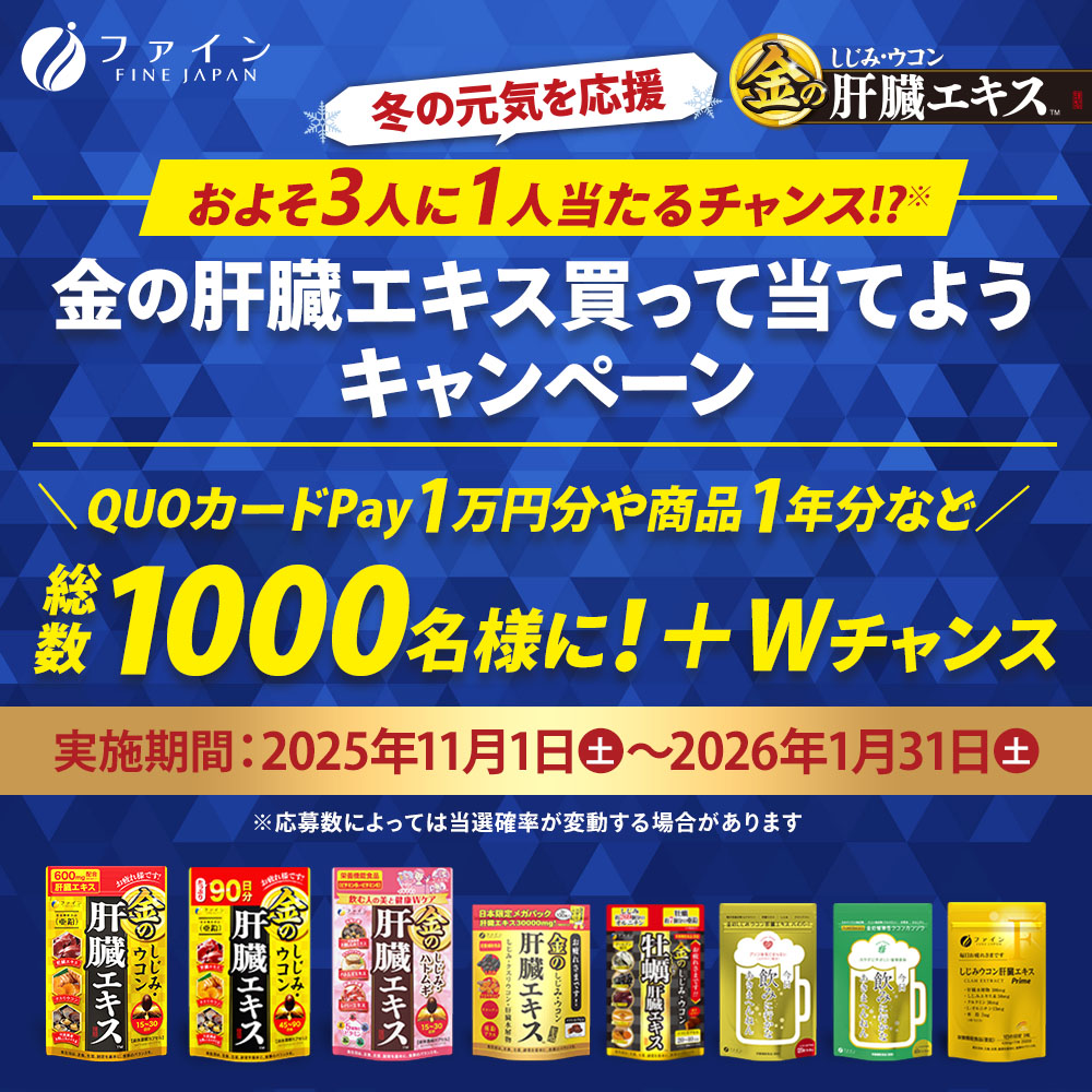 3人に1人が当たるチャンス!?(※1)「冬の元気を応援!金の肝臓エキス買って当てようキャンペーン」開催抽選で1,000名様にQUOカードPayや金の肝臓エキスシリーズ1年分が当たる! -