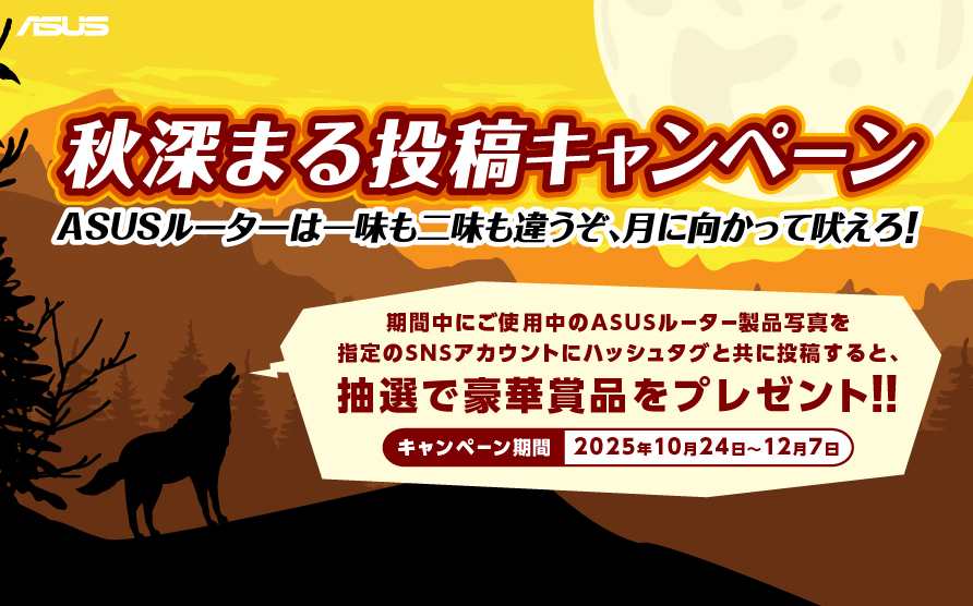 秋深まる投稿キャンペーン!ASUSルーターは一味も二味も違うぞ、月に向かって吠えろ!抽選で豪華賞品が当たる!ASUSルーターご愛用者向けX(旧Twitter)キャンペーンを開催!
