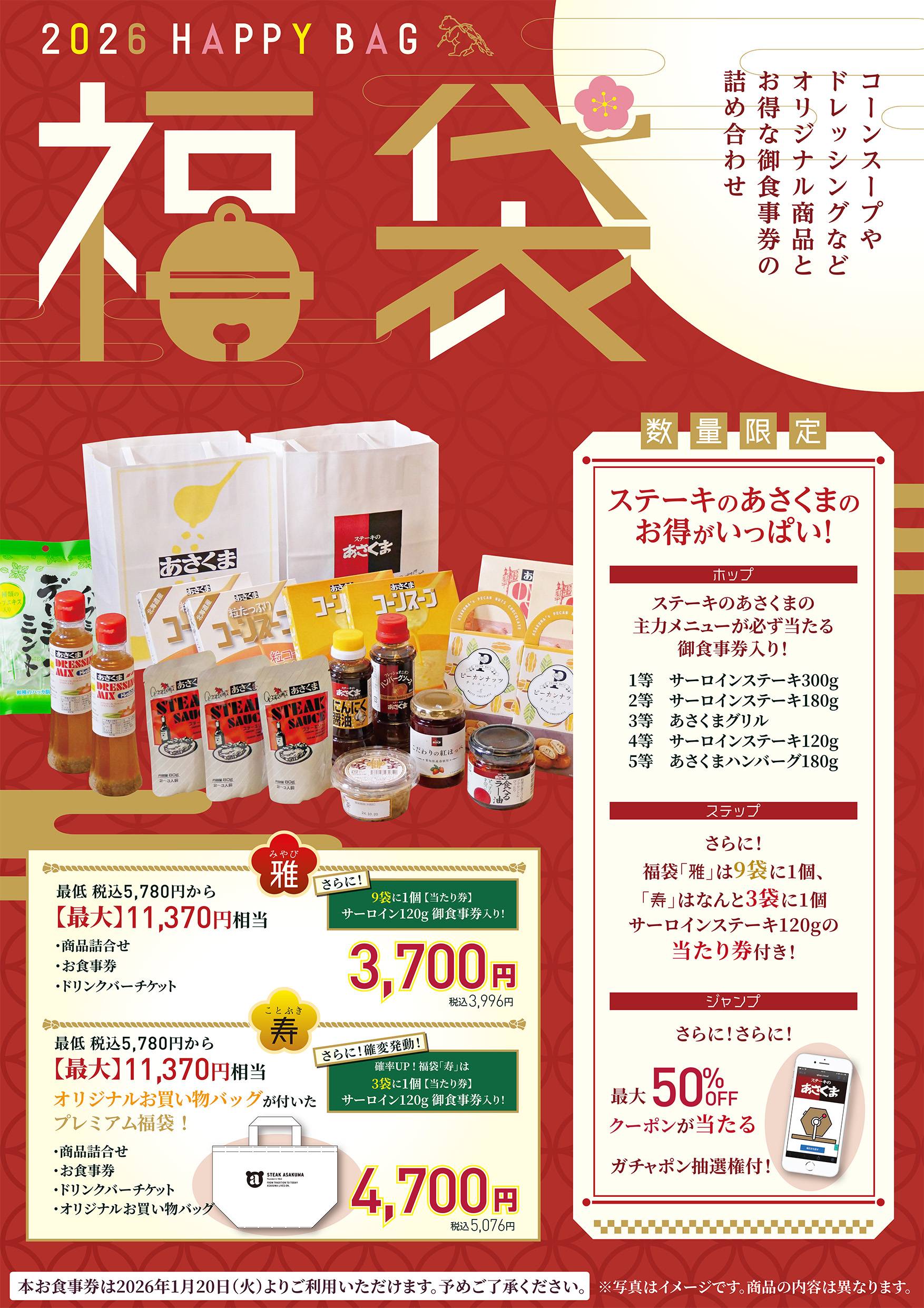 【ステーキのあさくま】数量限定!2026福袋12/26~販売開始 最大11,370円相当! -