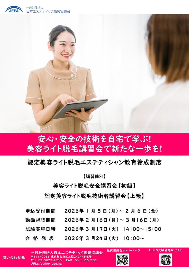 第16回美容ライト脱毛講習会(Eラーニング)受講受付開始のお知らせ(2026年1月5日より開始) -