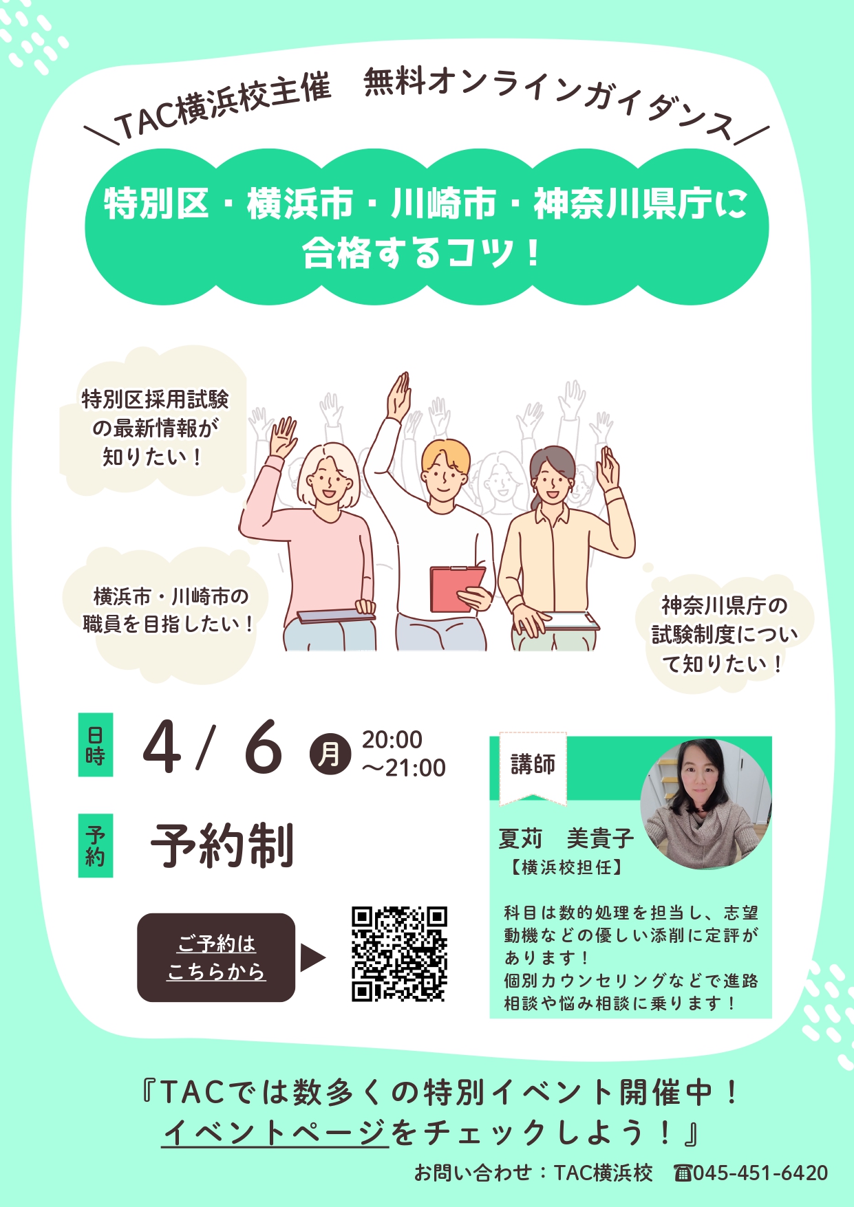 【TAC公務員】「特別区・横浜市・川崎市・神奈川県庁に合格するコツ!」を4/6(月)にオンラインで配信! -