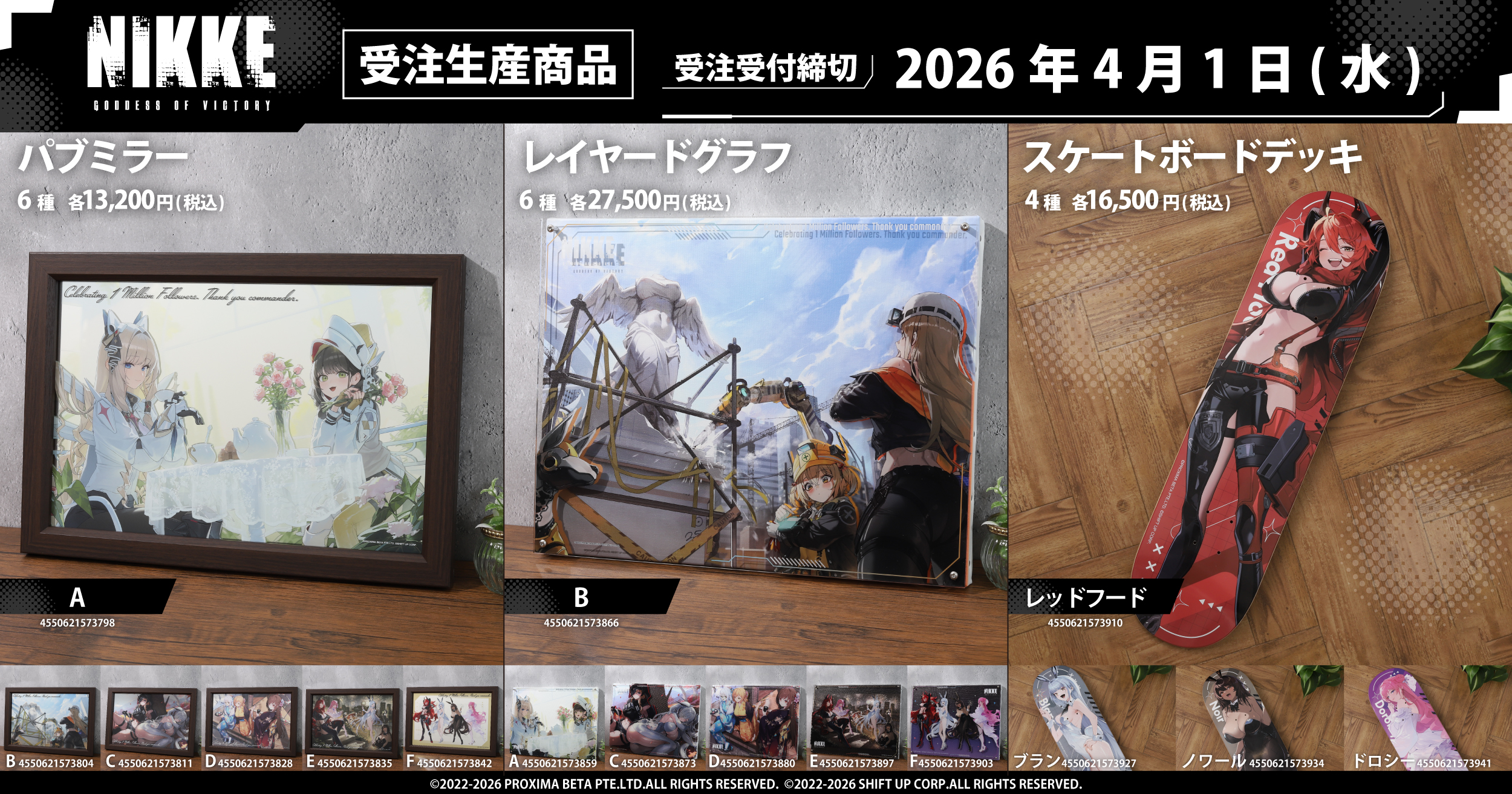 『勝利の女神:NIKKE』より、パブミラー、レイヤードグラフ、スケートボードデッキが受注生産商品で登場! -