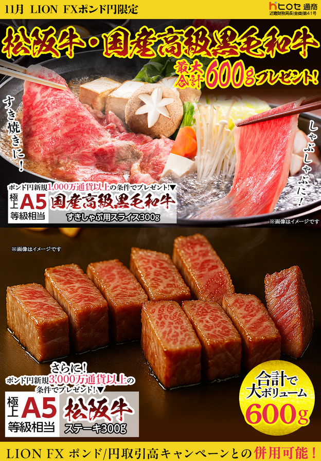 LION FXポンド円限定 松阪牛・国産高級黒毛和牛最大600gプレゼント!を実施!