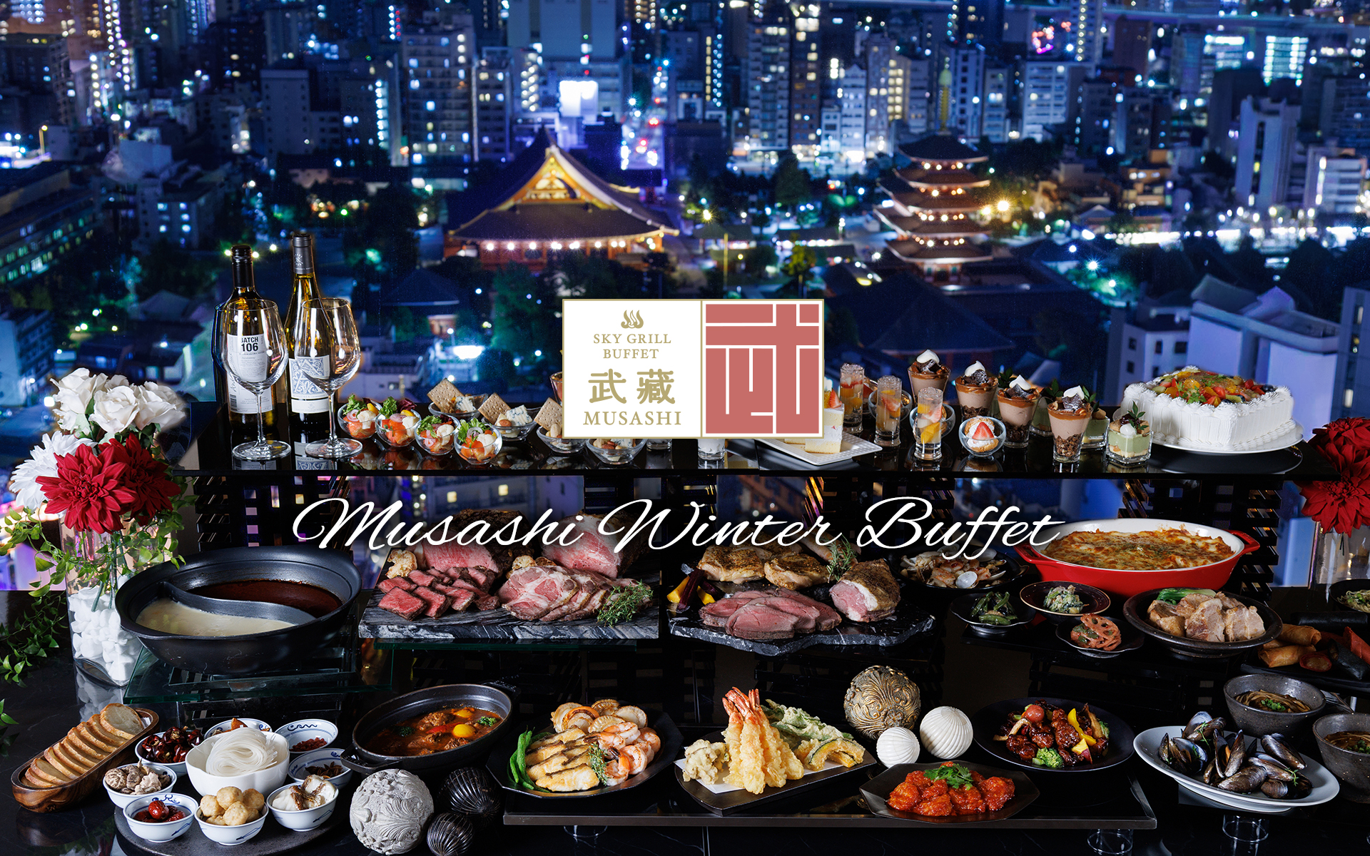 【浅草ビューホテル】冬の澄んだ夜景を望む地上26階で、約100種類の品数豊富な料理を味わう贅沢なウインターブッフェ。