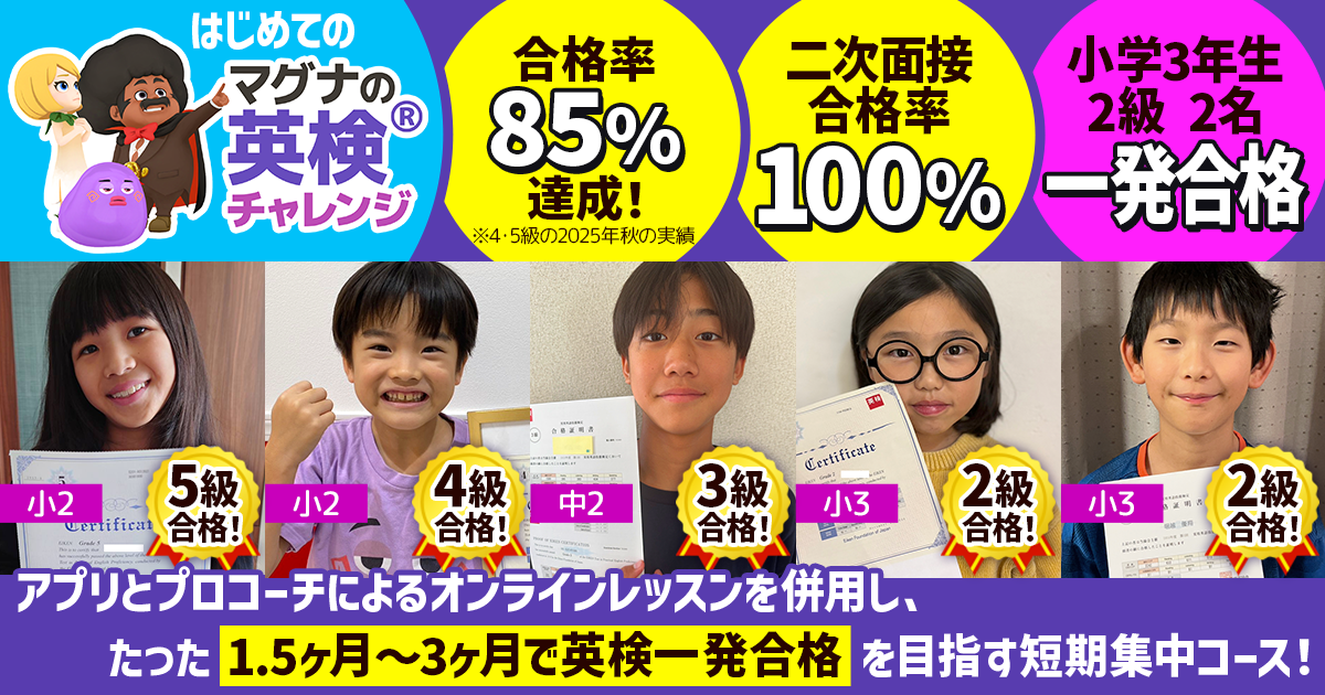 【はじめての英検(R)チャレンジ】英検5級4級の合格率が85%!第一回「マグナの英検チャレンジ」で驚きの成果報告! -