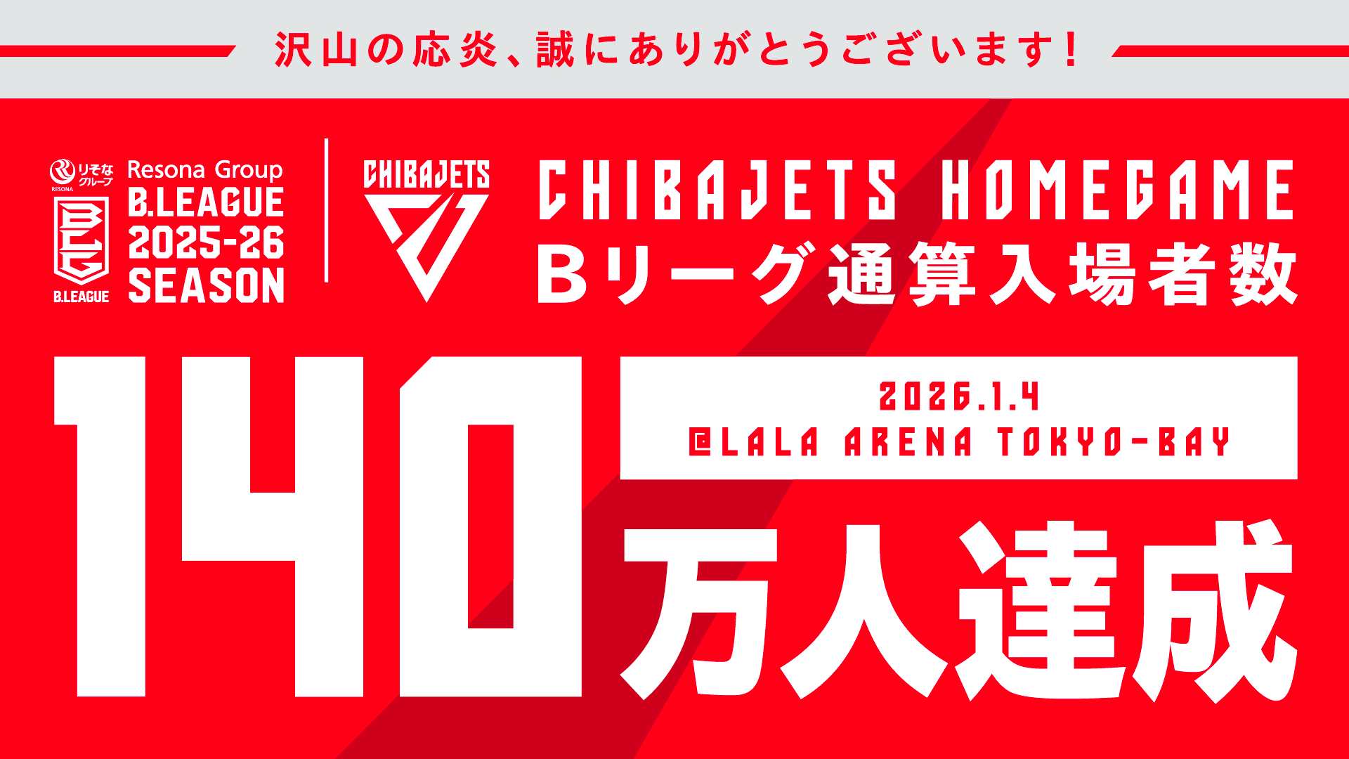 【千葉ジェッツ】Bリーグ最速でホームゲーム通算入場者数140万人達成!平均入場者数1万人も維持し続け、今後も地域から愛されるクラブを目指して邁進!! -