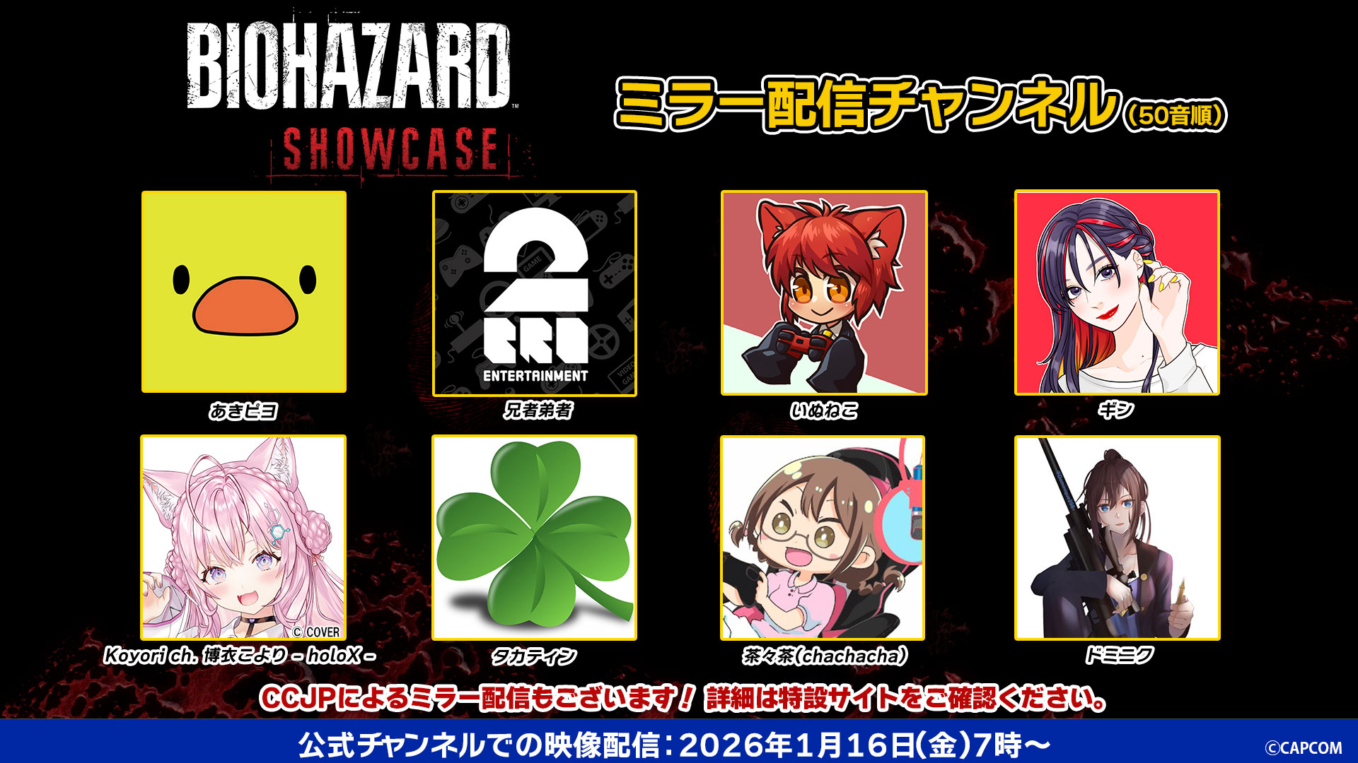 1月16日(金)あさ7:00より「バイオハザード ショーケース」配信開始! 人気配信者とのミラー配信チャンネル公開、および特別企画「みんなでウォッチパーティー!!」開催決定! -