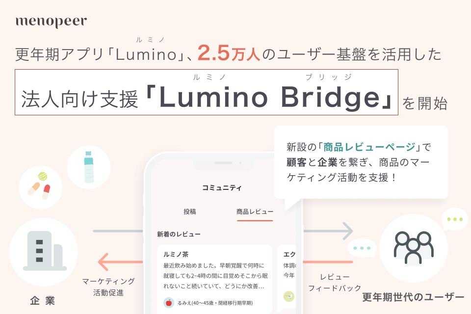 更年期アプリ「Lumino(ルミノ)」、2.5万人のユーザー基盤を活用した法人向け支援『Lumino Bridge』を開始。 新設の商品レビューページで顧客と企業を繋ぎ、更年期市場のミスマッチを解消 -