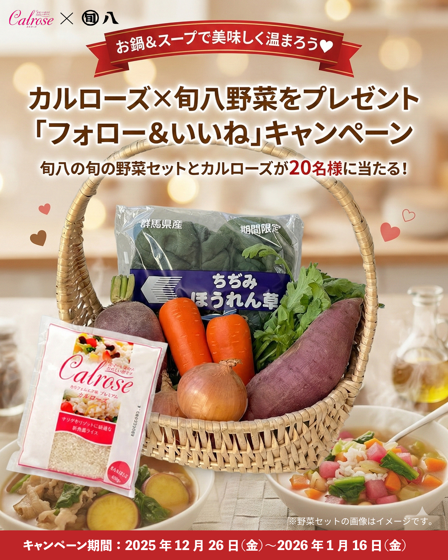 旬八青果店が厳選した“旬の野菜セット”と“カルローズ”が20名様に当たる お鍋&スープで美味しく温まろう 「冬のプレゼント」キャンペーン開催 2025年12月26日(金)~2026年1月16日(金) -