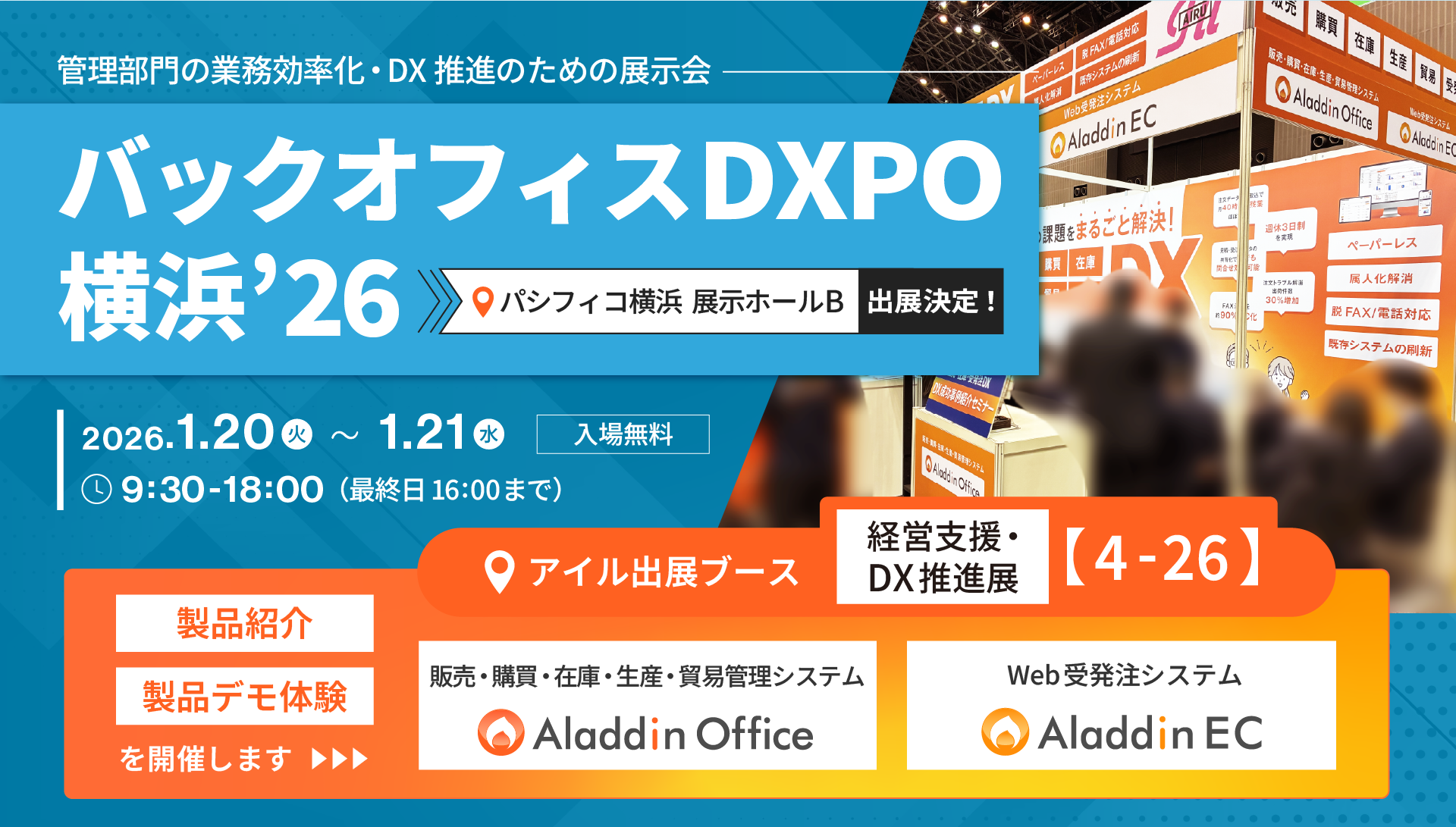 アイル、「バックオフィスDXPO 横浜’26」に出展し、販売・在庫管理システム「アラジンオフィス」と、Web受発注システム「アラジンEC」を紹介 -