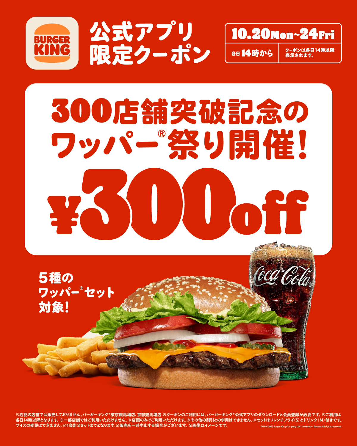 バーガーキング(R) が300店舗突破を記念して5種のワッパー(R) セットが最大30%オフ300円引きになる「ワッパー(R) 祭り」開催!5日間限定各日14時から公式アプリ限定クーポンを配信!