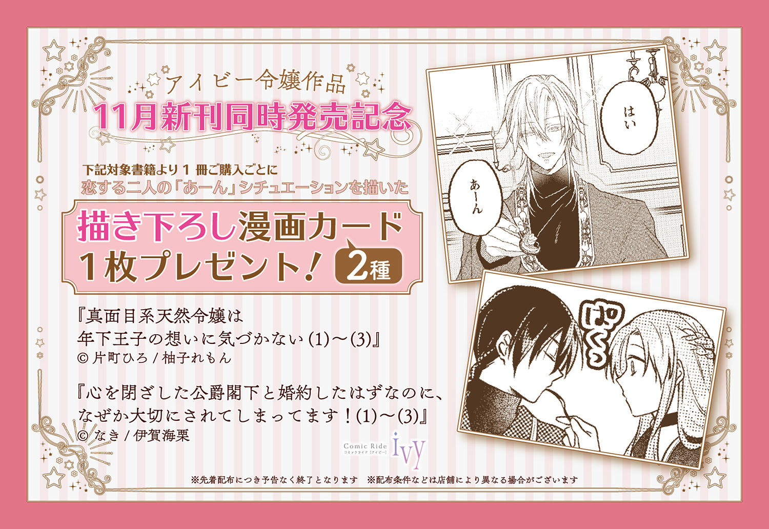 『心を閉ざした公爵閣下と婚約したはずなのに、なぜか大切にされてしまってます!』『真面目系天然令嬢は年下王子の想いに気づかない』11月28日同時発売!描き下ろし漫画カードがもらえる書店フェア開催! -