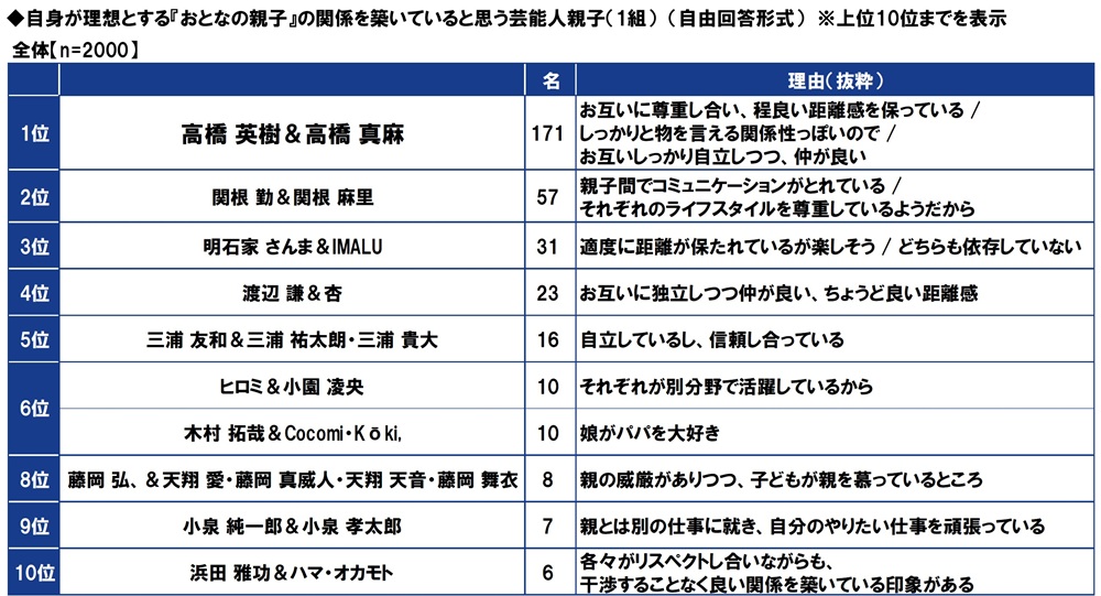 PGF生命調べ 理想の『おとなの親子』だと思う芸能人親子は? 「高橋 英樹さん&高橋 真麻さん」「関根 勤さん&関根 麻里さん」が3年連続1位・2位! -