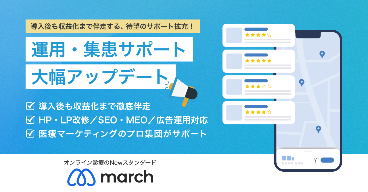 【サポート拡充!】オンライン診療システム「march」なら、導入時だけでなく、導入後も収益拡大まで、かゆいところに手が届くサポートにより徹底伴走! -