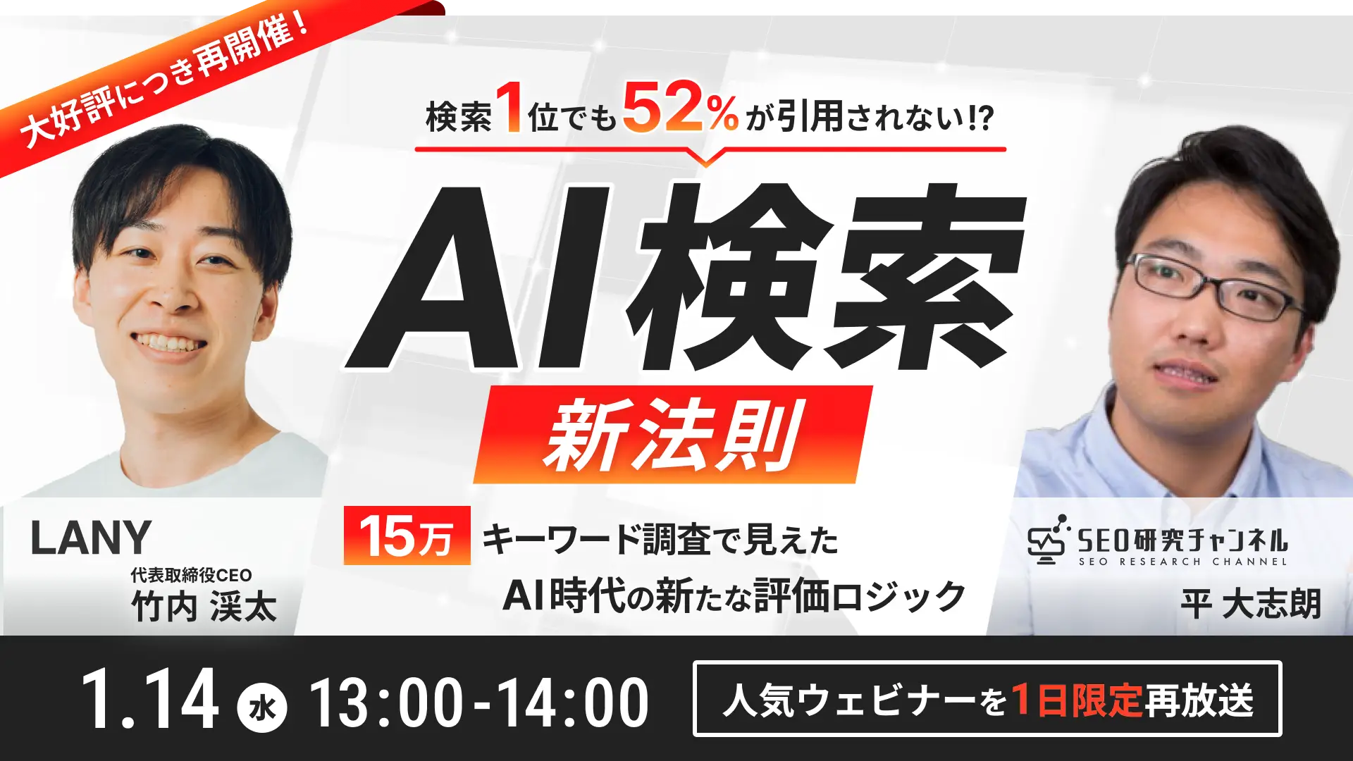 【無料アーカイブ放送】AI検索の新法則|検索1位でも52%が引用されない!?15万キーワード調査で見えたAI時代の新たな評価ロジック を1/14(水)に再開催 -