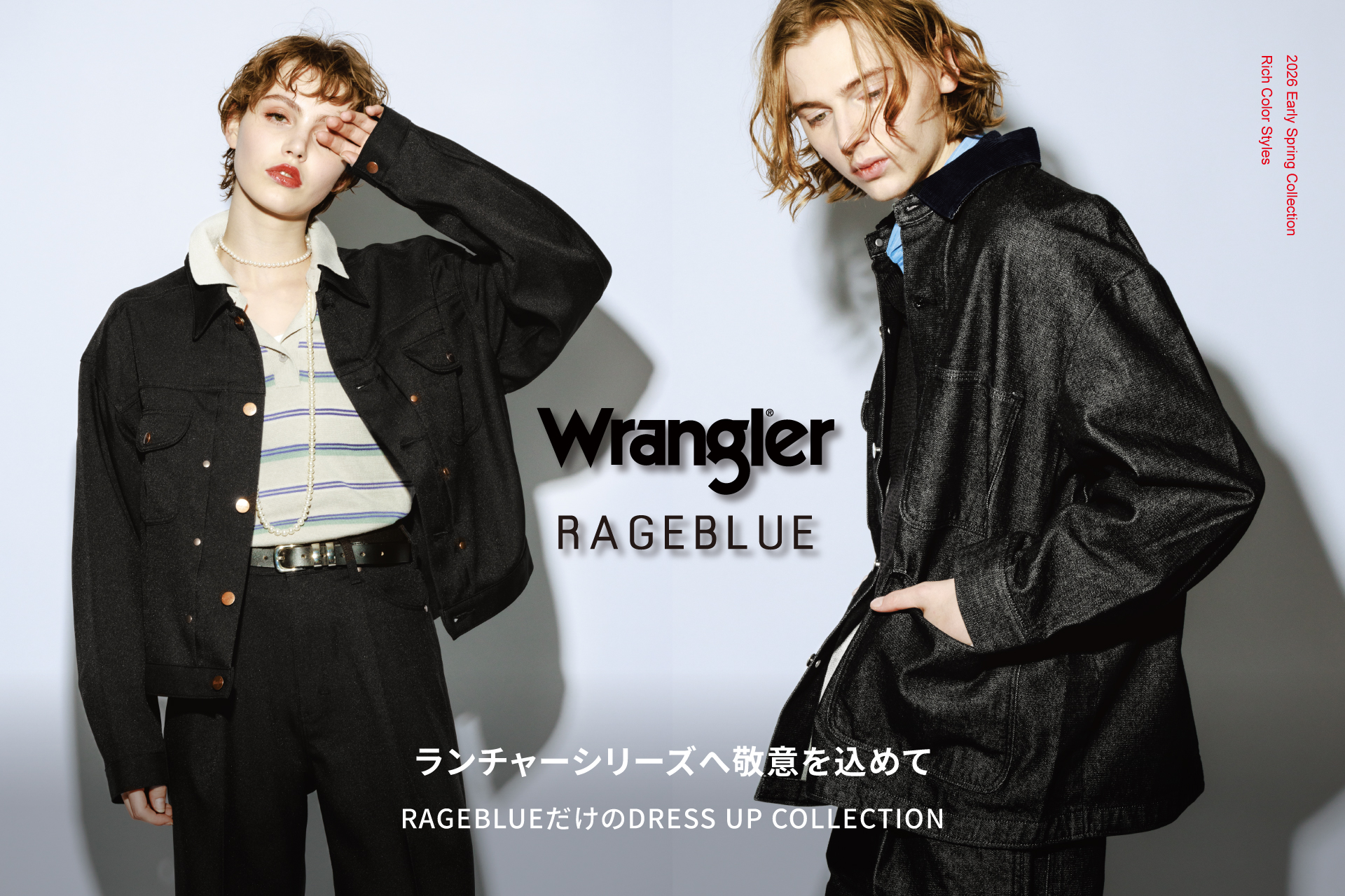 「RAGEBLUE」から、歴史のある人気ジーンズブランド「Wrangler」との別注コレクションが登場!メンズとレディース共に、品よく着こなせるセットアップ全4型を1月16日(金)より発売
