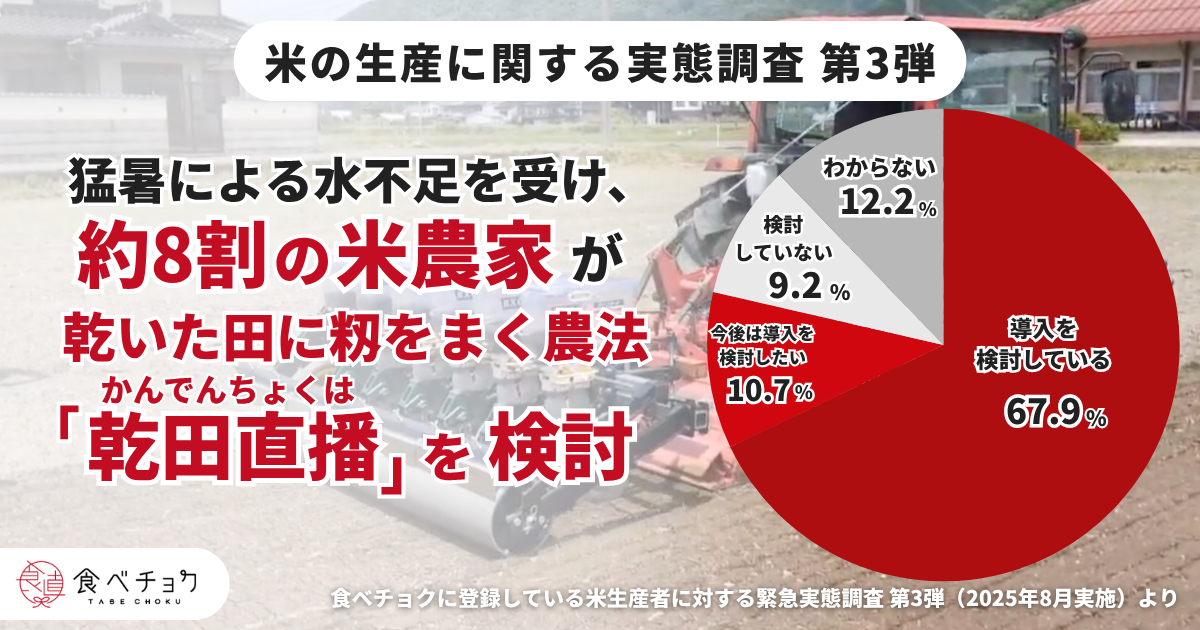 お米を乾いた田んぼで栽培する農法「乾田直播」、猛暑による水不足で導入検討する米農家は8割に迫る