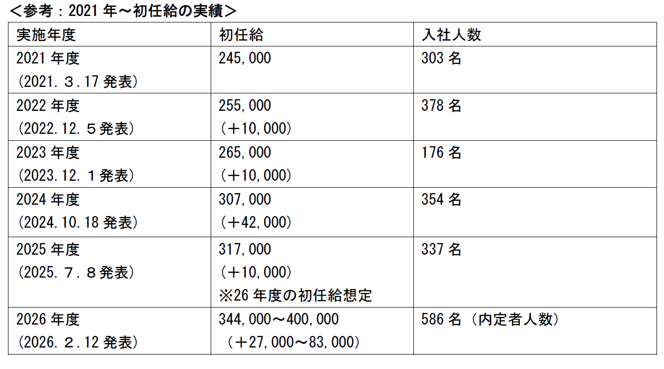 26年度新卒社員の初任給を最高40万円へ引き上げ