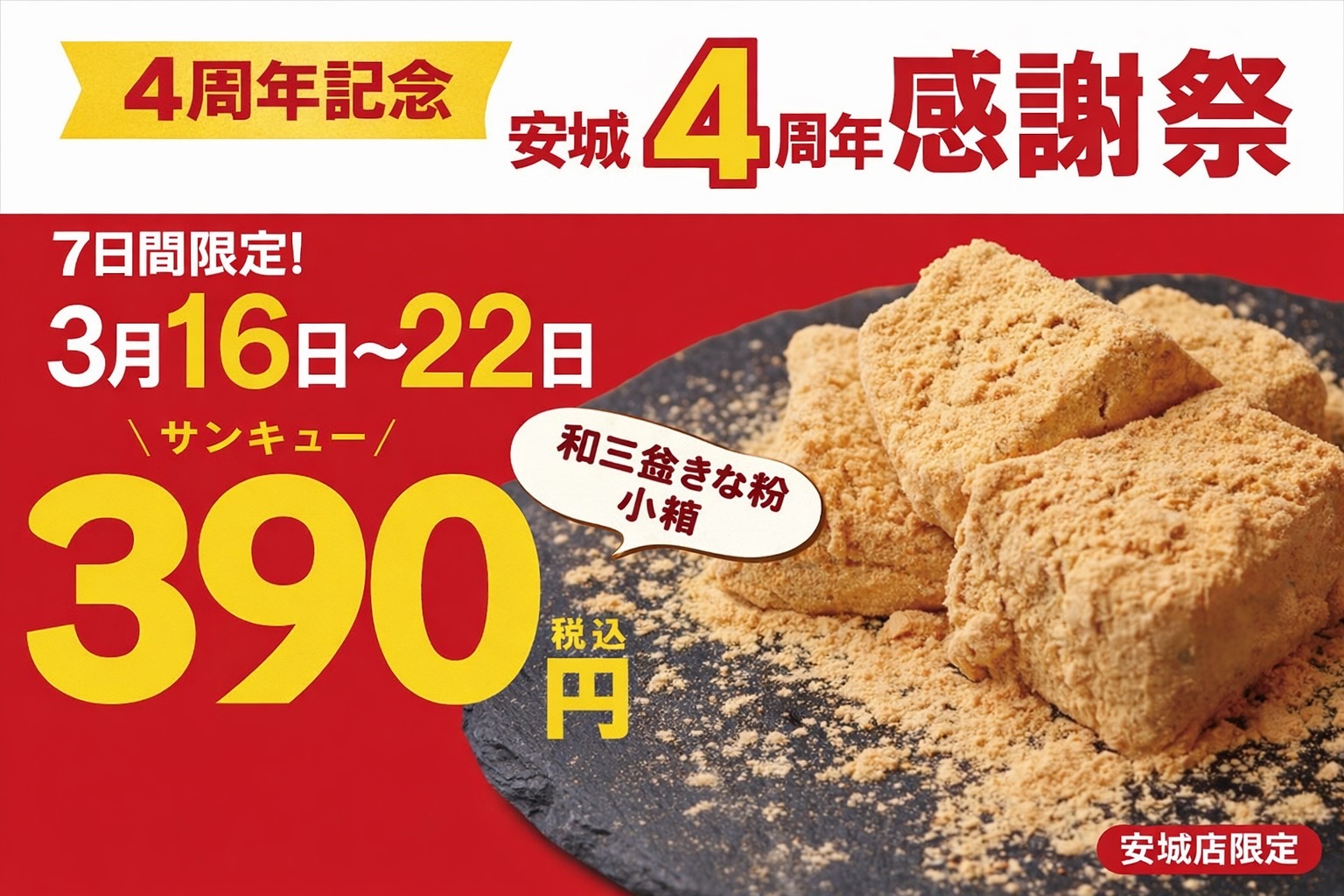 【4周年感謝祭】「とろり天使のわらびもち安城店」4周年記念キャンペーン開催!!~人気商品「和三盆きな粉 小箱」を特別価格390円で販売、さらに「アイスは別腹」との期間限定コラボも実施~
