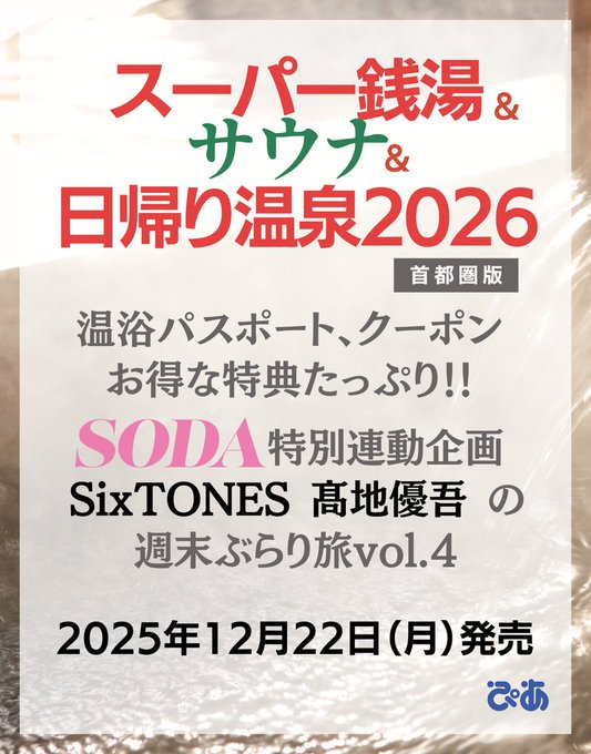 「SixTONES 高地優吾の週末ぶらり旅」第四弾の掲載も決定!『スーパー銭湯&サウナ&日帰り温泉2026 首都圏版』12月22日発売決定&本日より予約開始